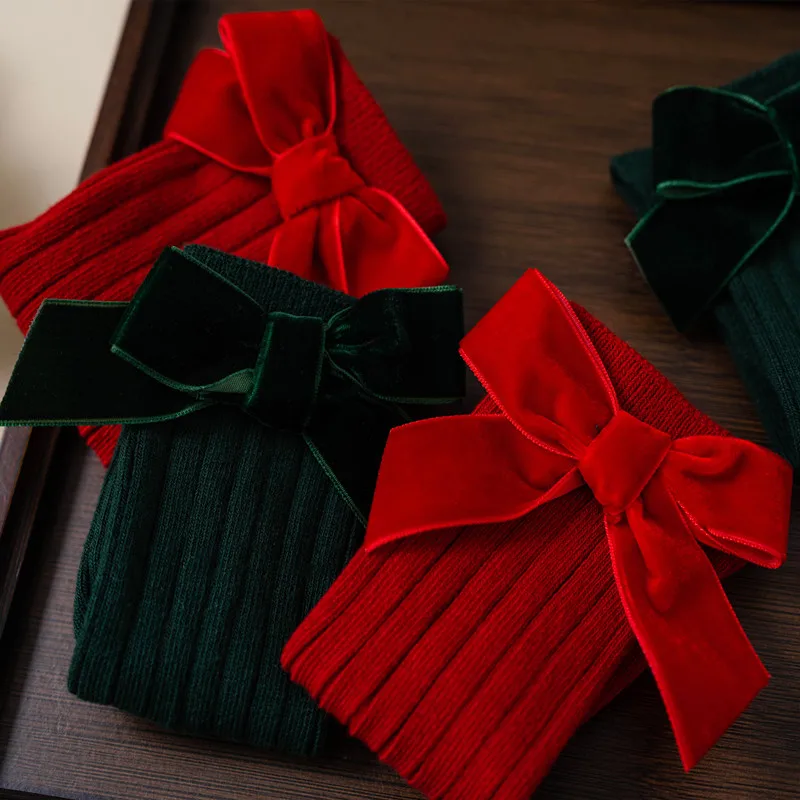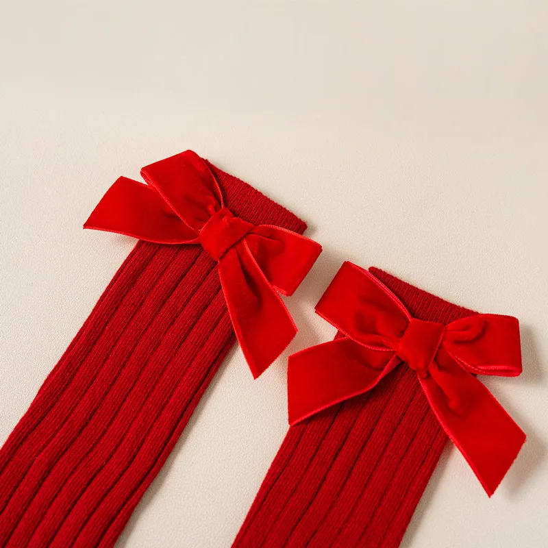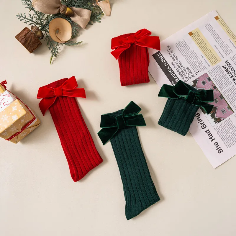 Weihnachtssocken für Mädchen, Herbst/Winter, Kleinkinder, rote Schleife, kniehoch, weiche Baumwolle, Kindersocken für 0-5 Jahre